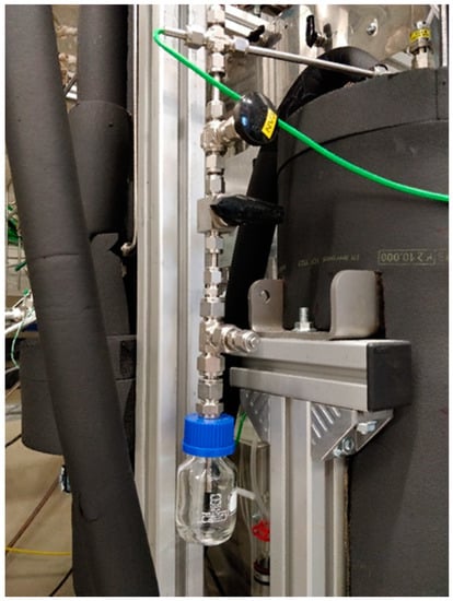 Since the CT is the largest vessel in the system with a volume of about 25 L, a quick liquid sampling (QS) was a prerequisite to avoid large back-mixing of gas as well as liquid in the vessel and to be able to detect gas phase changes in reaction experiments. Gas sampling before the hot trap would not have been possible due to potential damage of the MS from condensation of wax and liquid components inside the device. In Figure 6, the installation of the QS site is shown. Basically, it represents a glass vessel capable to collect a few milliliters of liquid in a minute-scale sampling time. It could be connected via a needle valve to the effluent of the heat exchanger at a certain point in time. The accompanied gaseous products entering the QS were directed to the MS during the time when the liquid samples were captured. The needle valve was opened into a certain position to avoid pressure loss in the setup.