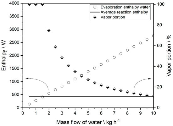 Figure 7 depicts the relationship between the pump’s water mass flow and the resulting enthalpy it could potentially take up. The theoretical vapor fraction is also shown, assuming the total reaction enthalpy is transferred to the water. An average reaction enthalpy from about 30 different experimental conditions is displayed for comparison. The reaction enthalpy ΔHR (W) was calculated based on Equation (4) from the standard reaction enthalpy ΔHR0 (−158.5 kJ mol−1), CO conversion XCO (-) and the molar feed flow of CO, (mol s−1).