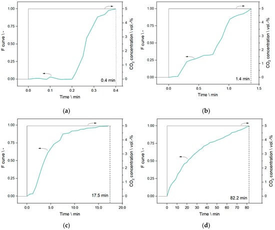 In Figure 8, the applied change in CO2 concentration and the respective delay is plotted as the F curve for the individual positions inside the pilot scale test rig. The provided times are the determined dead times. The time t = 0 min represents the time when the new setpoints were adjusted in the MFCs.