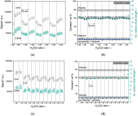 For switching the gas composition under the reaction, two different parameter combinations were chosen, see also Table 3. The syngas ratio was significantly changed from 1.95 (“H2/CO high”) to 1.38 (“H2/CO low”) in those settings so that a measurable change in the product composition could be expected [6,76]. At this point, the ratio was not lowered further in order not to force deactivation of the catalyst by high hydrogen consumption at increasing CO partial pressure. The length of each oscillation cycle was selected based on the dead time experiments.