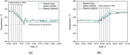 Excess water, in an average operation case of the pilot scale reactor above a required minimum water mass flow of approximately 1.5 kg h−1, can remove additional heat in a phase of cooling down the reactor. This heat is originating from the total heat capacity of the reactor. A strategy to reduce the reactor temperature could thus be to lower the pressure. Experiments to determine the reactor temperature response by changing water pressure have been carried out in this work. The water pressure was adjusted from 3 MPa to 2.4 MPa and back to 3 MPa by changing 0.1 MPa of pressure every 5 minutes while observing changes in the measured temperatures.
