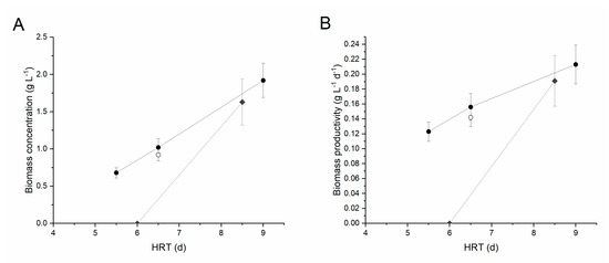 Biomass concentration (A) and productivity (B) at steady state as a function of the hydraulic retention time. Black circles indicate centrifuged digestate diluted 1:5, grey diamonds centrifuged digestate (CD) diluted 1:2, while open circle corresponds to FD diluted 1:5. Error bars represent standard deviation.