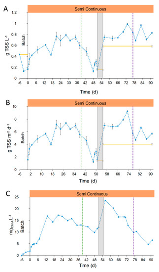 After day 35, the concentration of TSS started to decrease until minimum values close to 0.13–0.31 g TSS L−1 corresponding to productivity values of 1.2–2.9 g TSS m−2 d−1 (Figure 4). This point will be specifically discussed in Section 3.2.4. During Stage 2, the TSS concentration reached a mean value of 0.81 ± 0.11 g L−1. This concentration was similar to that obtained in the period from days 21–35 (Stage 1, 0.74 ± 0.05 g L−1).