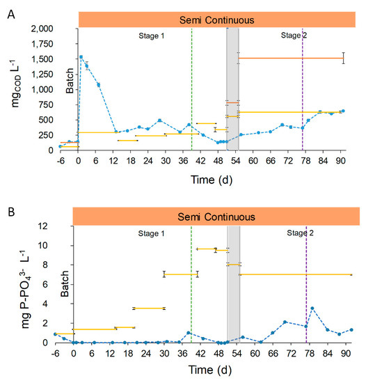 Chemical oxygen demand (COD) (A) and phosphorus (B) concentration during raceway operation. Blue dotted line represents the concentration of nutrient in the effluent (●●●). Continuous lines represent the concentration of nutrient in the influent. In Figure 5A, the orange line represents the tCOD ( ̶ ) and the yellow line is the soluble chemical oxygen demand (sCOD) ( ̶ ). Semi-continuous operation is represented in orange,