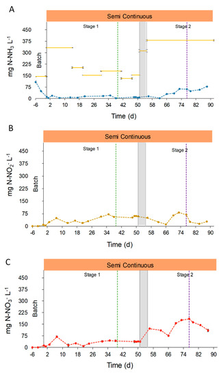 Evolution of the concentrations of the different forms of nitrogen. Graphic (A) represents the evolution of N-NH3 in effluent (●●●) and influent ( ̶ ). Graphic (B) represents the evolution of N-NO2− in effluent, (●●●), and Graphic (C) represents the evolution of NO3− in effluent (●●●). Semi-continuous operation is represented in orange,