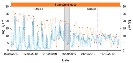 Dissolved oxygen (DO) concentration and solar irradiances evolution during the raceway operation. DO concentration is represented with blue dotted line (●●●) and solar radiation with orange dotted line (●●●). Semi-continuous operation is represented in orange,