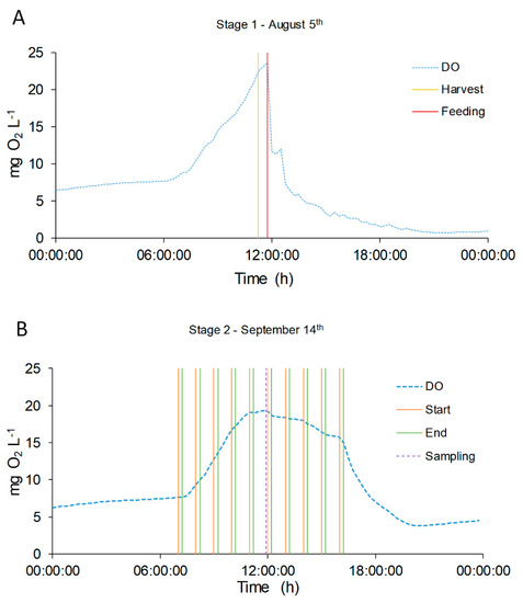 DO concentration evolution in two single days, representative of the two feeding modes: August 5th (A) and September 14th (B). DO concentration is represented with green dotted line (●●●). In Graphic (A) the yellow line ( ̶ ) represents the harvest time and red line ( ̶ ) the feeding time. In Graphic (B) the orange line ( ̶ ) represents the start feeding time and the green one ( ̶ ) the end feeding. The violet dotted line (●●●) represents the sampling time.