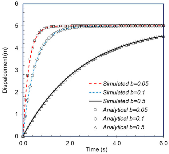 Comparison of the displacement calculated from the simulation and the analytical solution, i.e., Equation (4).