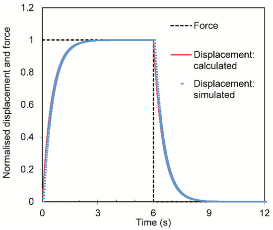 A second validation was performed by comparing the creep and recovery responses of the system in Figure 1 to that calculated using Simulink (Version 9.1, The MathWorks Inc., Natick, MA, USA). As depicted in Figure 3, the simulated displacements were in close agreement with the calculated values from Simulink. After the force was applied, the displacement increased rapidly until it reached a steady state. When the force was removed, the displacement decreased rapidly, and as time increased, it approached asymptotically to zero.