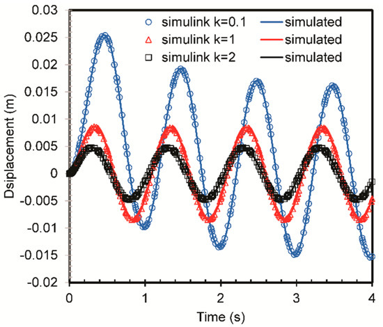 A third validation was performed by comparing the displacement response of the system in Figure 1 to a sinusoidal load (dynamic force), to the value calculated using Simulink (Version 9.1, The MathWorks Inc. Natick, MA, USA), as shown in Figure 4. Furthermore, in this case, the simulated displacements were in close agreement with the calculated values.