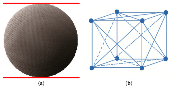 In the first case, the spherical particle (Figure 5a) was constructed from cubic lattice cells (Figure 5b). It contained 137,059 beads with each connected to the nearest neighbours and along face diagonals by linear springs or by KV bonds. This work focuses on viscoelasticity (KV bonds), and the case of purely elastic spheres (linear springs) was computed for comparison. The case of linear springs, in fact, has been already studied, and mass-spring cubic lattice cell models are known to represent (purely) elastic homogenous isotropic materials if the connection between the masses and the stiffness of the springs are selected appropriately [26]. For a cubic lattice cell with nearest neighbour and next nearest-neighbour linear springs, the Poisson’s ratio is predicted by the theory to be 0.25 [26], and Young’s modulus is given by the following relationship [27]: