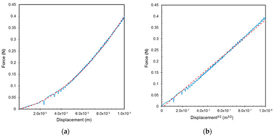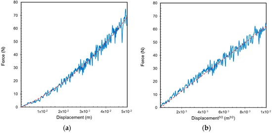 Figure 8a presents the normal contact force as a function of displacement calculated from the simulations using the disorder model with a spring constant of 200 Nm−1. Although this involved a smaller number of beads, the data were a closer fit to a Hertzian response (Figure 8b), but with greater fluctuations of the force. As mentioned above, these fluctuations normally would be removed with an artificial dissipation term, but in this validation example, it is noteworthy that, as expected, disordered structures increased the amplitude of the perturbation. Using Equation (1) and assuming that υ = 0.25, the Young’s modulus was calculated to be 12.4 kPa.