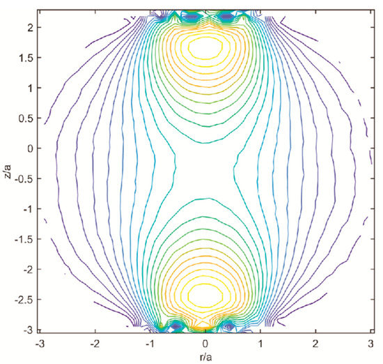 The bulk shear stress, which is the sub-surface principal stress difference, i.e., |(σ1 − σ3)|/2, may be calculated for each bead. The principal stresses (σ1 and σ3) were calculated from the virial stress and kinetic energy contributions [32] for each bead. The contours of the calculated shear stress are presented in Figure 7, where a is the contact radius and r is the particle radius. The shape of the contours was similar to that calculated theoretically [33,34]. The maximum value was found at a depth of 0.5a. This is in a close agreement with theoretical value of 0.48a [33].