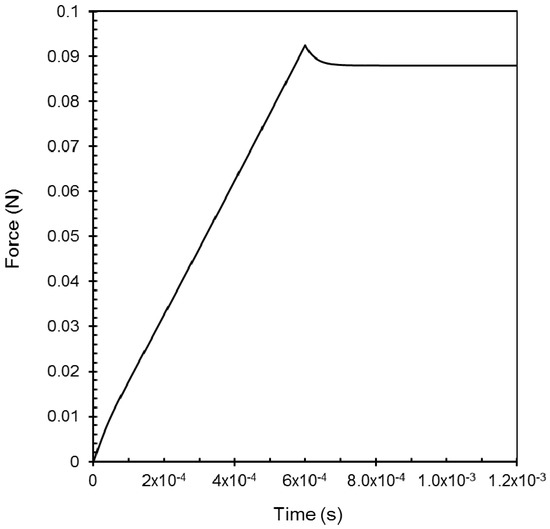 Figure 11 presents the simulated contact force as a function of time for a viscoelastic spherical particle based on the disorder model with a spring constant of 200 Nm−1 and a dashpot constant of 10−6 Nm−1 s. The force and displacement data were fitted to Equation (2) in order to obtain the value of A, from which the Young’s modulus was obtained using Equation (1) as 112 KPa, which was greater than the calculated value for the elastic particle.