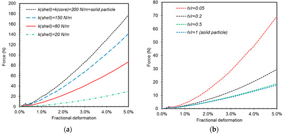 Figure 13 presents the force as a function of fractional deformation (δ/2r) of HC-SS particles with different values of kcore and h/r. Figure 14 presents the force as a function of fractional deformation (δ/2r) of SC-HS particles with different values of kshell and h/r. The force profiles in Figure 13 and Figure 14 can be compared with experimental data to simplify theoretical equations for small deformation e.g. for microcapsules [36].