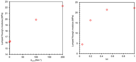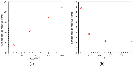 Based on the results, a lumped Young’s modulus could be calculated using Equation (1), which represented the equivalent Young’s modulus the particle would have if it were homogeneous. Figure 15 and Figure 16 present the lumped Young’s moduli of HC-SS and SC-HS particles as a function of kshell and kcore, respectively, and as a function of the h/r ratio. As expected, with increasing values of kshell or kcore, the Young’s modulus increases for HC-SS and SC-HS particles, respectively. For the HC-SS particle, increasing the h/r ratio decreased the Young’s modulus, while for the SC-HS particle, it increased the value.