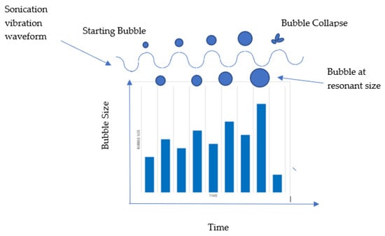 Figure 3 shows that the growth of cavitation bubbles is dependent on the frequency of the applied ultrasonication. At higher frequencies, the cycle of the ultrasonication waves is shorter and restricts bubble growth; however, at low frequencies, the bubbles will grow slower and are more violent when they collapse [