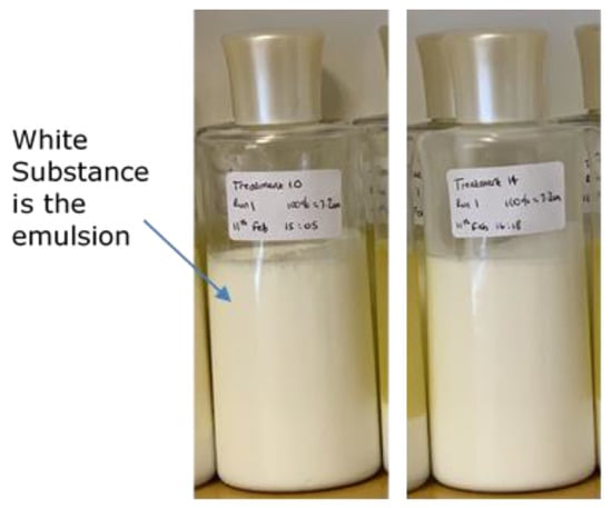 Whilst the stability performance of treatment 10 was exactly the same as that of treatment 14 over the 14-day observation period, it is likely that treatment 14 would last longer. This statement can be made, as even though both were prepared with an HLB of 5, the probe depth for treatment 14 was 20 mm higher during its preparation.