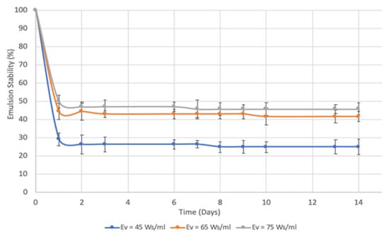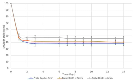 Figure 10 that, by increasing the depth of the sonotrode during sonication, the stability of the resulting emulsion will increase. Treatment 13, prepared with a probe depth of 45 mm, was 45.83 ± 3.32% stable by day 14. The emulsion prepared with the lowest probe depth (5 mm), treatment 1, was 38.13 ± 3.00% stable after 14 days. Therefore, increasing the depth of the probe by 40 mm increased the emulsion stability by 7.70%.