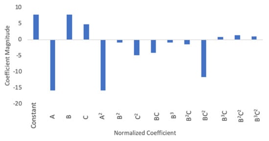 Section 3.6, the interaction between factor A (HLB) and any of the other factors was ignored. As a result, a partial factorial design of the experiments was used to create 14 emulsions. This also means that the response model for this experiment, whereby the response represents the 100% stability time of an emulsion, will also have 14 terms. From this response model, three of the 14 terms will be first-order terms representing factors A (HLB), B (energy density) and C (sonotrode probe depth). The response model is shown in Equation (6), whereby