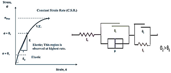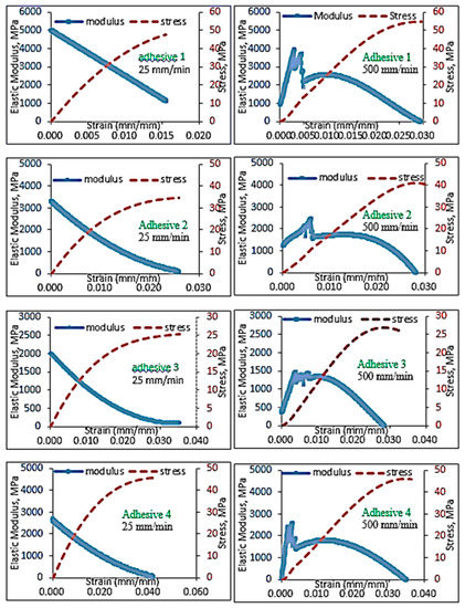 - The strain rate sensitivity will be described by incorporating Ludwik-type equations into our modeling process. For this purpose, the modified Bingham elastic-viscoelastic-plastic model will be altered to a novel configuration to accommodate possible multilinear-elastic regions predicted with pronounced elasticity usually observed at high strain rates and impact situations. The stress–strain behavior of adhesives will be captured with high statistical accuracy in tensile mode at different extension rates from 25 mm/min to 500 mm/min.