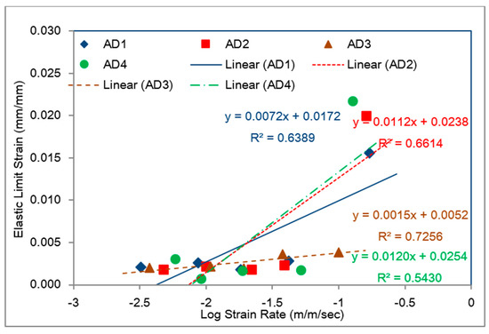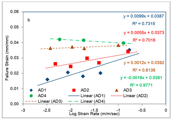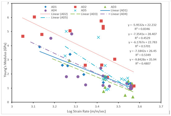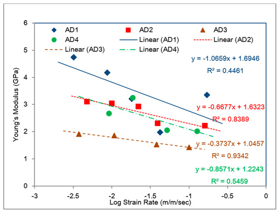 - Based on the slopes of the Ludwik-type linear regression lines for the tensile stress–strain data, Young’s modulus, E2, for adhesive 1 had the highest sensitivity to strain rate followed by adhesive 4 and adhesive 2, respectively. Young’s modulus for adhesive 3 was found less sensitive to the strain rate.