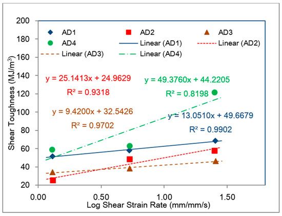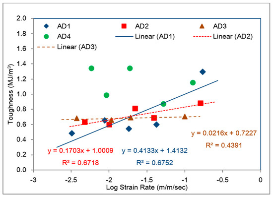 - The average toughness–strain rate behaviors of the model adhesives revealed that adhesive 1 had the lowest toughness at the lowest strain rate, but it also had the highest slope in its regression line, indicating it to be the most desirable adhesive for impact applications. It is interesting to note that, all adhesives used in first phase contained elastomeric tougheners in the form of carboxyl terminated butadiene acrylonitrile (CTBN) copolymer, as well as polyurethane adducts besides inorganic fillers except for adhesive 1. Only adhesive 1 used in first phase included just inorganic fillers. Adhesive 4 had the highest toughness for the strain rate range shown, but its toughness seems to be fairly constant (i.e., rate independent), which is an undesirable feature for an impact resistant adhesive. It contained the least amount of inorganic fillers with 14.72 wt %, which was made up of calcite, talc zeolite and calcium silicate.