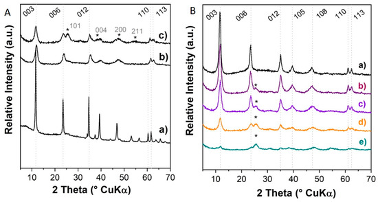 PXRD patterns of compounds obtained by direct coprecipitation: (A) with different LDH matrices and a ratio of 2 (a) [ZnAl/FreshTiO2]2, (b) [MgAl/FreshTiO2]2, and (c) [MgAl/AgedTiO2]2; (B) for MgAl LDH prepared with different MgAl/TiO2 ratios (a) [Mg2Al-CO3], (b) [MgAl/TiO2]8, (c) [MgAl/TiO2]4, (d) [MgAl/TiO2]2, and (e) [MgAl/TiO2]0.66. * corresponds to the 101-reflection line of anatase TiO2.