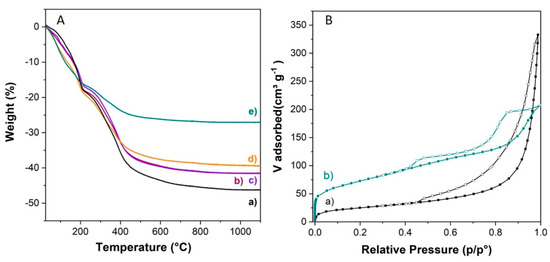 (A) TGA curves of [MgAl/TiO2] nanocomposites obtained by coprecipitation for different MgAl/TiO2 ratios: (a) [Mg2Al-CO3], (b) [MgAl/TiO2]8, (c) [MgAl/TiO2]4, (d) [MgAl/TiO2]2, and (e) [MgAl/TiO2]0.66. (B) N2 adsorption-desorption isotherms of (a) [Mg2Al-CO3] and (b) [MgAl/TiO2]0.66.