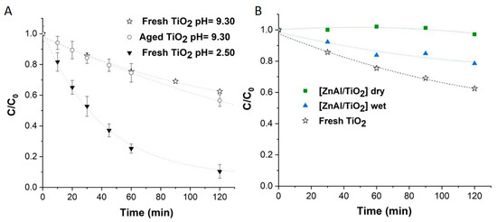 The two nanocomposites obtained by the impregnation of ZnAl LDH matrices noted that [ZnAl/FreshTiO2]2dry and [ZnAl/FreshTiO2]2wet were tested, as shown in Figure 6B. It should be underlined that better degradation results were obtained when the impregnation process was carried out from an undried LDH suspension compared to LDH powder, the latter displaying almost no photoactivity. These results showed that the immobilization of TiO2 was probably more efficient using undried LDH, allowing for a greater surface interaction between the LDH and TiO2 nanoparticles, which led to a higher immobilized amount. However, both samples displayed a reduced photocatalytic efficiency compared to pure TiO2 basic dispersion, which could be explained by a lower quantity of photocatalyst and/or a partial aggregation and decrease in its photo efficiency.