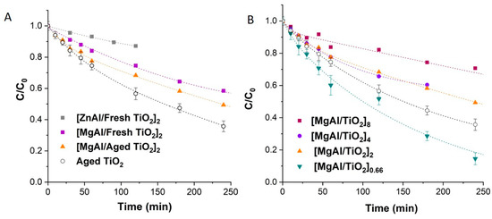 Since impregnation did not appear as a suitable approach to immobilize TiO2 on LDH and to produce efficient nanocomposites, we tested an alternative strategy; samples obtained by coprecipitation which corresponded to the direct formation of LDH in the presence of a dispersion of TiO2 nanoparticles. In Figure 7A, the efficiency of the nanocomposites obtained from the chemical composition ZnAl- and MgAl-LDH and fresh TiO2 were compared. [MgAl/FreshTiO2]2 led to the highest OII degradation. The results even further improved when aged TiO2 was involved in the MgAl nanocomposite. In this latter case, the immobilized TiO2 behaved at the earliest stages of the degradation in the same way as the pure colloidal aged TiO2, while after one hour a decrease in the rate of the reaction occurred, showing a kinetic of degradation in two steps.