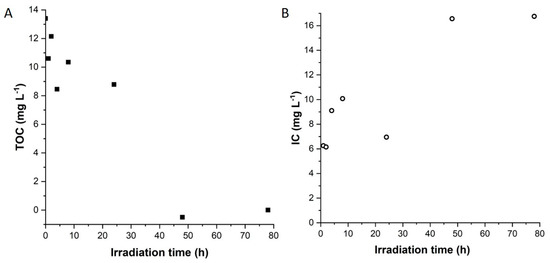 (A) Total organic carbon (TOC) and (B) inorganic carbon (IC) measurements under irradiation of OII in the presence of [MgAl/TiO2]0.66. Conditions: [OII] = 5.10−5 M, [TiO2] = 0.5 g L−1, m[MgAl/TiO2]0.66 = 63.2 mg L−1, pH = 9.30.