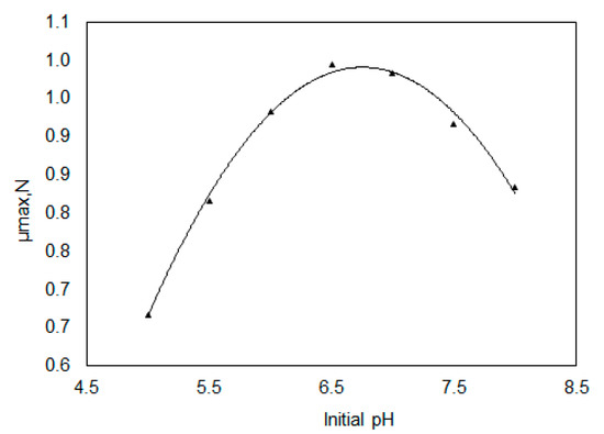 Regression analysis can be used to find the best fit for a straight line on a plot of 1/μ vs. 1/S, and the values of μmax and KS are determined. The variation of μmax with initial pH would determine an optimum value of pH at which μmax is maximum, thus, describing optimum conditions for the microbial growth. By plotting the values of normalized μmax, i.e., μmax,N vs. initial pH, a second-order correlation, similar to that obtained by Lallai et al. [19] and Datta et al. [12], is then obtained, as given in Equation (3)