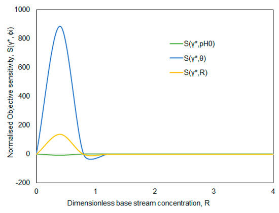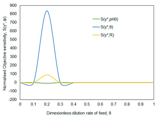 The main objective of this analysis is to determine the parametric range of input variables at which the CSTBR system becomes vulnerable. The system behavior is demonstrated in terms of normalized objective sensitivities coefficients as a function of input parameters. The mathematical model of the system consists of the Equations (22)–(25), (28), and (33). The Equations (22)–(25) and (28) were simultaneously solved using Runga–Kutta 4th order method, and Equation (33) is solved using the trapezoidal numerical integration method. The results are illustrated in Figure 3, Figure 4, Figure 5, Figure 6, Figure 7, Figure 8, Figure 9, Figure 10 and Figure 11. Figure 3, Figure 4 and Figure 5 show normalized objective sensitivities of the pH-minimum, S(γ*, ϕi), as a function of the input parameters, i.e., dimensionless dilution rate of base feed stream (θ), the dimensionless concentration of base, (R) and initial pH (pH0) of the system.