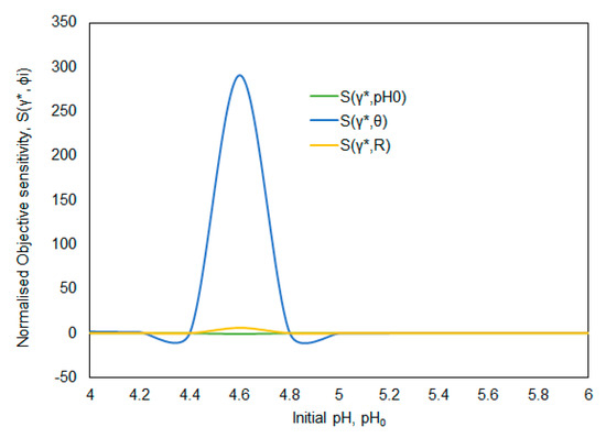 Normalized objective sensitivities S(γ*,ϕi) as a function of initial pH (pH0) of the system.