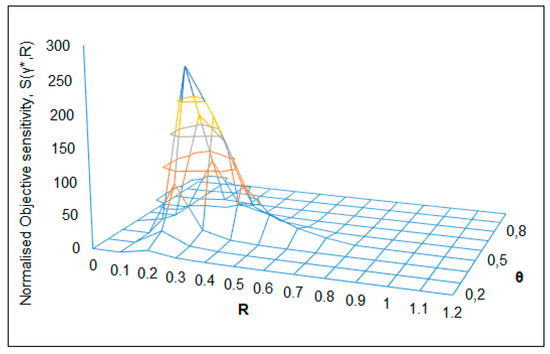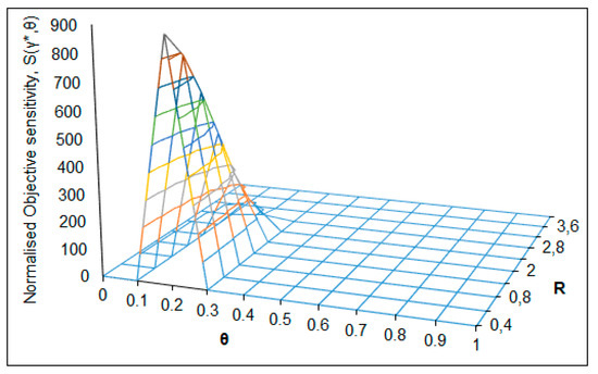 Normalized objective sensitivity S(γ*, θ) as a function of parameters R and θ.