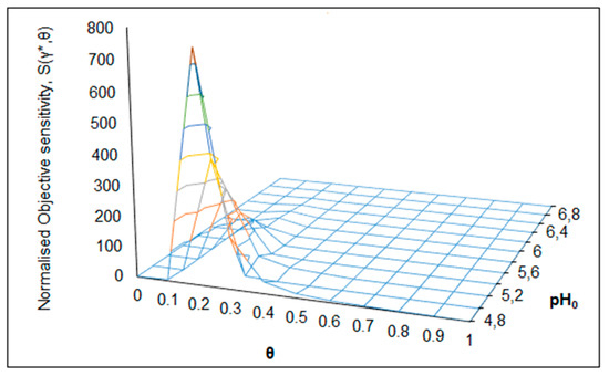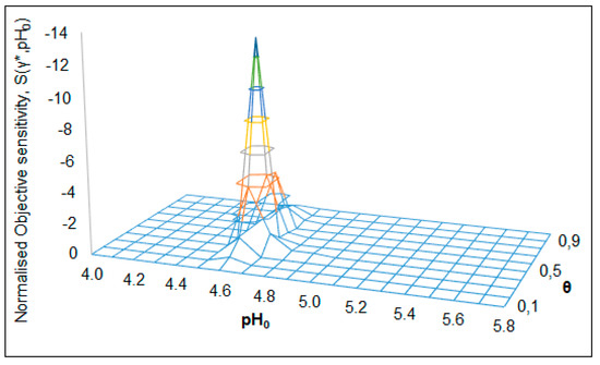 The behavior of normalized objective sensitivity as a function of pH0, S(γ*, pH0) with the variation of R and θ are shown in Figure 10 and Figure 11. The influences of R and pH0 on S(γ*, pH0) at a fixed value of θ = 0.7 are presented in Figure 10. From the figure, it can be observed that the sensitivity function S(γ*, pH0) exhibit sensitive behavior in a negative direction. The S(γ*, pH0) reached its lowest value of −7.8 when the R and pH0 values are at 0.8 and 4.6, respectively. The sensitive region and critical values of input variables are presented in Table 6.