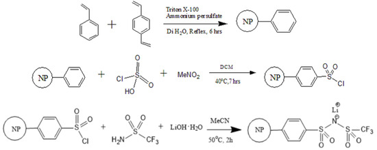 As outlined in Figure 1, the synthesis began with the preparation of crosslinked polystyrene nanoparticles following the method of Brijmohan et al. [22]. Chlorosulfonation of the PS nanoparticles was successfully carried out with a minor modification of a reported procedure [22]. The new TFSI-like PS-bound lithium salt, PSTFSILi, was synthesized in a single-step by reacting the chlorosulfonated PS nanoparticles with CF3SO2NH2 in the presence of LiOH. The incorporation of a similar lithium salt moiety (–SO2NLiSO2CF3) on a benzene ring has been previously reported, but involved three steps starting from the benzene sulfonyl chloride analog [23].