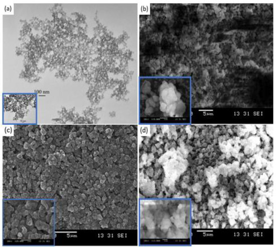 (a) Scanning electron microscopy (SEM) of the PS nanoparticles, where the diameter of the particles was around 50 nm; (b) SEM of the PSTFSILi nanoparticles, where the diameter of the particles was around 500 nm; (c) SEM of the PSPhSILi nanoparticles, where the diameter of the particles was around 500 nm; (d) SEM of the PSDTTOLi nanoparticles, where the diameter of the particles was around 350 nm [21,25].