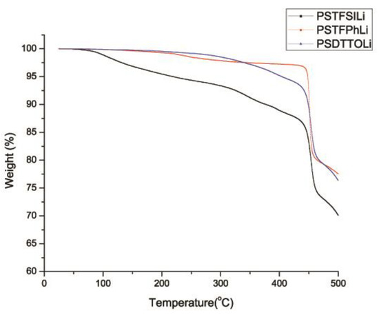 FTIR Spectroscopy: FTIR spectra of the nanoparticles were obtained by dispersing the sample in anhydrous potassium bromide. For PSTFSILi, the peak at 1000–1400 cm−1 corresponded to the stretching of the C–F bond. The broad peaks in the range of 1350–1300 cm−1 (s) and 1180–1140 cm−1 (s) were due to the O2S–N-bond. For PSPhSILi, strong peaks around 3063.53 cm−1 corresponded to aromatic C–H stretching and 1500–1400 cm−1 related to aromatic C=C stretching. The peak around 1630 cm−1 represents the S–N–S combination bond, which indicates that the reaction was complete. For PSDTTOLi, after lithiation of PSDTTO, the peak at 1717.43 cm−1 shifted to 1705.73 cm−1, and 1639.34 cm−1 shifted to 1637.34 cm−1, which can be assigned to the stretching vibration band of carbon with the existence of three sulfone electron withdrawing groups. These data partially support the proposed structures of the lithium bound polymer salts.