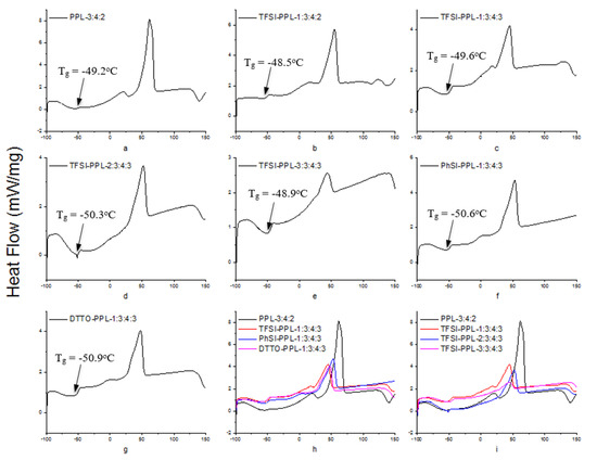 Heat flow versus temperature of the differential scanning calorimetry DSC curves: (a) weight ratio of PEO:PEGDM:LiTFSI (PPL) = 3:4:2, (b) weight ratio of PSTFSILi:PEO:PEGDM:LiTFSI (TFSI–PPL) = 1:3:4:2, (c) weight ratio of TFSI–PPL = 1:3:4:3, (d) weight ratio of TFSI–PPL = 2:3:4:3, (e) weight ratio of TFSI–PPL = 3:3:4:3, (f) weight ratio of PSPhSILi:PEO:PEGDM:LiTFSI (PhSI–PPL) = 1:3:4:3, (g) weight ratio of PSDTTOLi:PEO:PEGDM:LiTFSI (DTTO–PPL) = 1:3:4:3, (h) four best performing membranes, (i) various weight ratios of PSTFSILi.