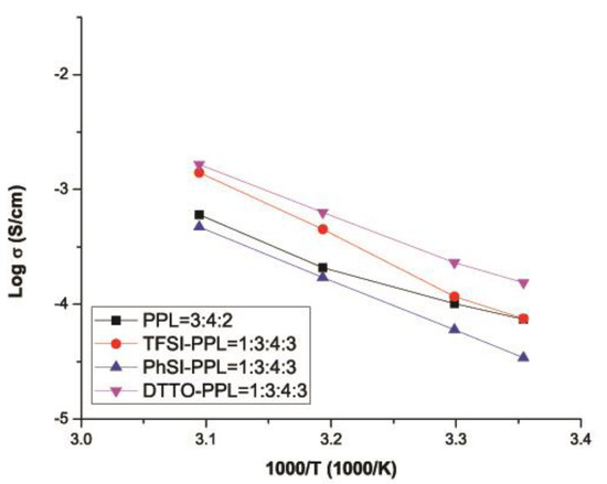 To compare the performance of our electrolytes, we compared the data with that of similar work published in the literature. For example, Armand et al. reported a single-ion BAB triblock copolymer, P(STFSILi)–PEO–P(STFSILi) that displayed very good ionic conductivity of 1.3 × 10−05 S cm−1 [32]. In another study, Feng et al. developed a similar single lithium-ion conducting polymer electrolyte based on the poly[(4-styrenesulfonyl)(trifluoromethane sulfonyl)imide] anion. However, the ionic conductivities could only reach 7.6 × 10−06 S cm−1 at 25 °C and 10−04 S cm−1 at 60 °C [23]. In this study, the ionic conductivity of TFSI–PPL (Figure 9) at the weight ratio of 1:3:4:3 displayed 3.0 × 10−03 S cm−1 at 70 °C, which is superior to that of the PhSI-PPL at 1.27 × 10−03 S cm−1. The best ionic conductivity of 3.23 × 10−03 S cm−1 at 70 °C was achieved with DTTO–PPL at the weight ratio of 1:3:4:3.