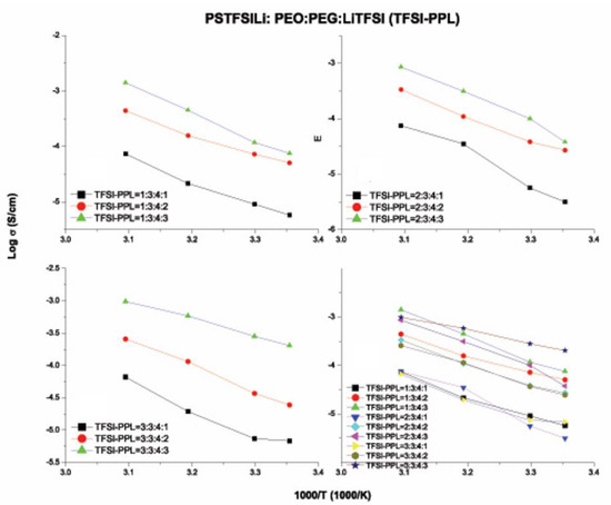 Ionic conductivity versus temperature of various weight ratios of PSTFSILi–PEO–PEGDM–LiTFSI (TFSI–PPL) electrolytes.