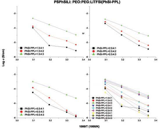 Ionic conductivity versus temperature of various weight ratios of PSPhSILi–PEO–PEGDM–LiTFSI (PhSI–PPL) electrolytes.