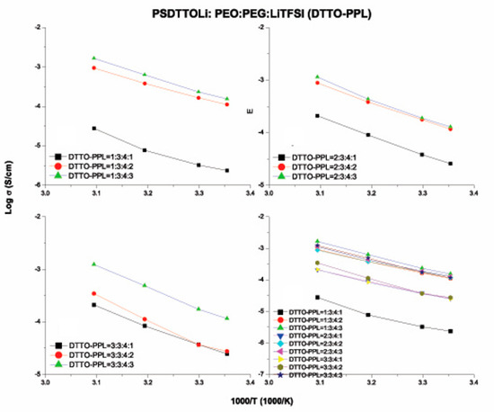 Ionic conductivity versus temperature of various weight ratios of PSPhSILi–PEO–PEGDM–LiTFSI (DTTO–PPL) electrolytes.