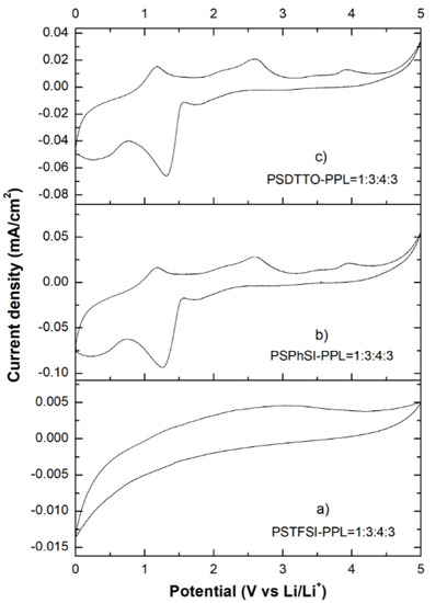 For practical applications, an electrolyte system should exhibit excellent electrochemical stability in excess of 4.5 V since secondary lithium-ion batteries typically operate in the voltage range of 2.8–4.35 V [34]. The characteristic CV properties for each of the three best electrolyte membranes are depicted in Figure 14. According to the CV curves, both PhSI–PPL and DTTO–PPL films at the weight ratio of 1:3:4:3 displayed electrochemical stability up to 4.2 V. The PhSI–PPL membrane showed an anodic peak at 1.26 V, while the DTTO–PPL membrane exhibited another anodic peak at 1.31 V [35]. The TFSI–PPL electrolyte at the weight ratio of 1:3:4:3 displayed the best electrochemical stability as no significant electrochemical activity appeared below 4.8 V versus Li/Li+.