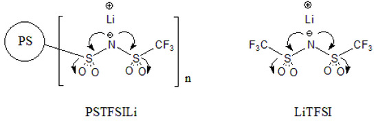 The rationale for designing PSTFSILi is the striking similarity with LiTFSI (as illustrated in Figure 15) with regard to the negative charge on the nitrogen atom being delocalized by two sulfone groups and one trifluoromethane group. This creates less interionic attractions between the cation and anion, commonly described as a low lattice energy salt [36]. Therefore, this TFSI–PPL solid polymer electrolyte also shows potential use with high-voltage cathode materials, which cannot be safely tested with liquid electrolytes due to their lower electrochemical stability.