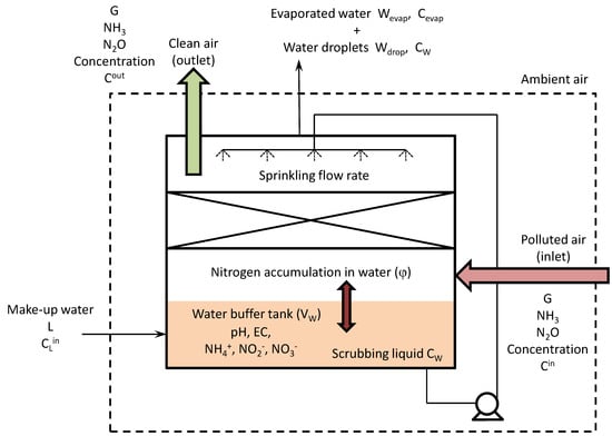 where () and () are the gaseous ammonia mass flow rates entering, and leaving the system, respectively. While, () and () are the gaseous nitrous oxide mass flow rates entering, and leaving the system, respectively, () is the amount of nitrogen contained in the fresh water (make-up water) entering the system to replace the amount of evaporated water, () is the mass flow rate of other nitrogenous substances potentially generated by the biological activity in the scrubbing liquid, except N2O (i.e., N2, NOx), is the mass flow rate of nitrogen substances potentially leaving the system by droplet entrainment, () is the consumption rate of nitrogen used for growth of microorganisms, and () is the nitrogen mass accumulated in water in the forms ammonium, nitrite and nitrate ions (called φ). Assuming that the presence of an efficient demister prevents droplet entrainment, Equation (1) can be rewritten as: