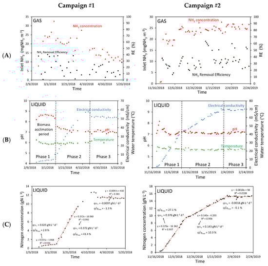 Experiment results recorded for campaigns #1 and #2. (A) Ammonia concentration in the air entering the biotrickling filter and ammonia removal efficiency determined from measurement in the gas phase; (B) Parameters measured for the scrubbing liquid in the buffer tank (temperature, pH and electrical conductivity); (C) Total nitrogen concentration in the scrubbing liquid deduced from the electrical conductivity measurement (Equation (6)).