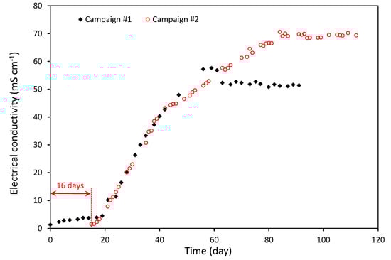 Comparison between EC changes recorded for campaigns #1 and #2. A shift of 16 days was applied to the results for campaign #2 to match the two curves accurately and to take the biomass acclimation period recorded in campaign #1 into account.
